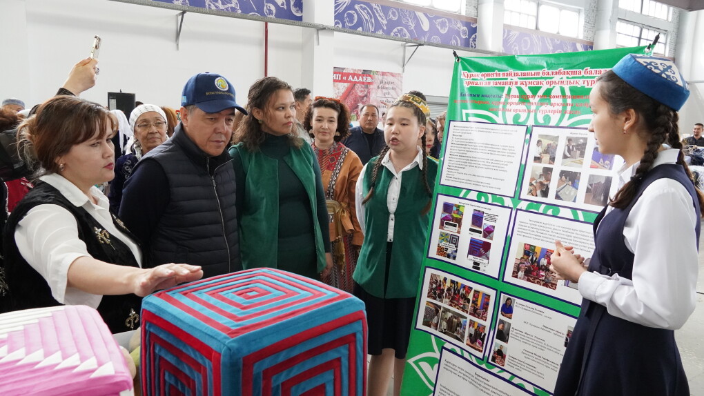 – Бұл жәрмеңкеге өзімнің 8-сыныпта оқитын екі оқушым – Нұрайым Есболсын және Айша Досжанмен келіп отырмын. Біз арнайы осы шараға арнап құрақ техникасымен тігілген, балабақша балаларына арналған жұмсақ орындықтар – пуфтар дайындадық. Ұл балаларға арналған пуфта «құдық» өрнегін, қыз балаларға арналғанында «қайшы» өрнегін қолдандық. Бұл – біздің шағын экспериментіміз. Қазіргі балабақшаларда жиі кездесетін ағаш орындықтардың орнына осындай ұлттық өрнекпен көмкерілген, жұмсақ әрі ыңғайлы пуфтарды ұсынғымыз келді. Басты мақсатымыз – балалар ұлттық ою-өрнек түрлерін жастайынан танып өссе екен, – деді аталмыш мектептің көркем еңбек пәнінің мұғалімі Самал Баймурзина.