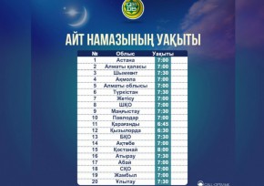 Қазақстан мұсылмандары Діни басқармасы сол күні оқылатын Ораза айт намазының еліміз бойынша әзірленген кестесін ұсынды, - деп хабарлайды Massaget.kz тілшісі.