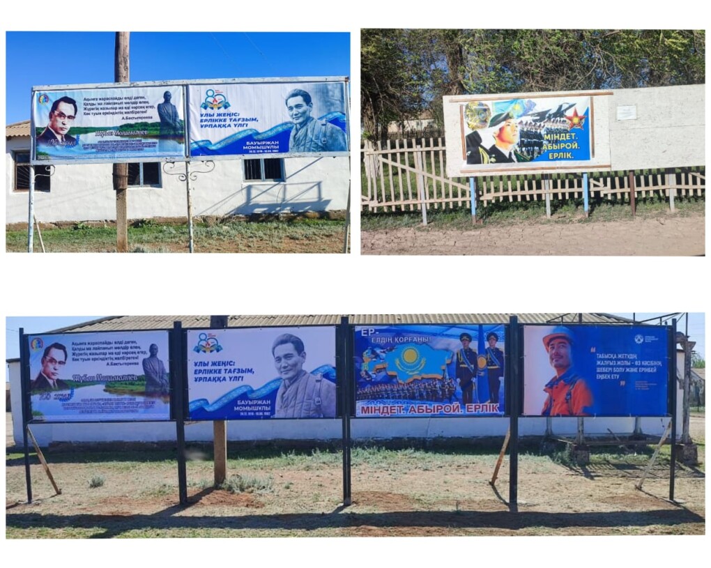 – Ауылдағы стендтерді де талапқа сай жаңарттық. Әрқайсысы 1,20*2.0 метрлік 10 стенд ілінді Қарауылтөбе көшелеріне. Оларға тазалық, ұлттық құндылықтарымыз, еңбекқорлық, ел бірлігі, отбасы тәрбиесі туралы баннерлер іліне бастады. Бұл іргелі іске толығымен қаржылай қолдау көрсеткен азаматтардың есімін атап өтейін. Олар – Алмас Өтежанов, Асылхан Шайхиев, Мереке Тұрсынғалиев. Әр бастамаға қол ұшын созуға дайын азаматтардан кенде емес Қарауылтөбе. Сондай жандардың арқасында Ұлы Отан соғысы және тыл ардагерлерінің суреттері ілінген тақта жаңартылды, ауылда дала қызықтары ұйымдастырылып, қос киіз үй тігіліп, ас берілді, – дейді ауылдық округтің әкімі Жәнібек Абиров.