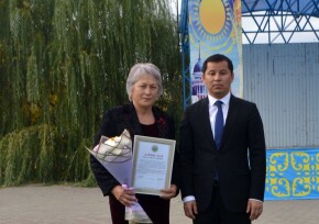 Бұдан әрі салтанатты жиын барша ұстазға арналған аудан әкімі М.Өмірәлиевтің құттықтау тілегімен жалғасып, зейнетке шыққан аудан мұғалімдеріне алғысхаттар табыс етілді.