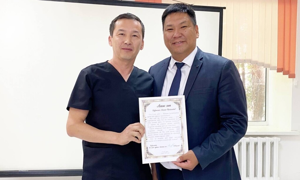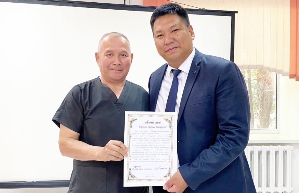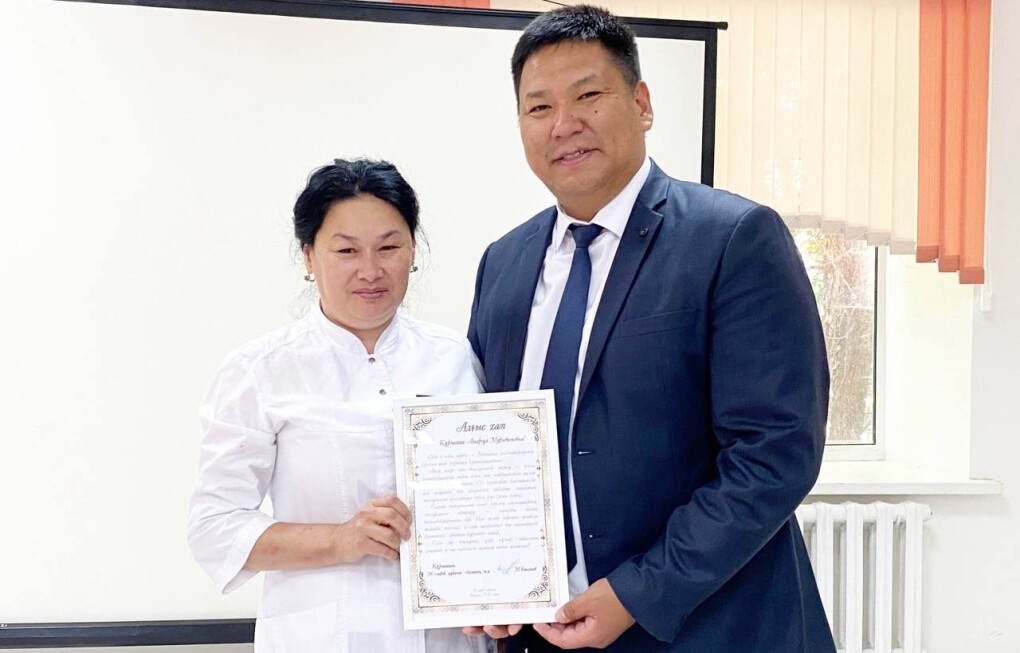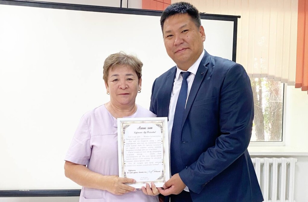 ​- Сіздерді кәсіби мерекелеріңізбен шын жүректен құттықтаймын. Күнделікті еңбегіңіз адам өміріне араша түсіп, денсаулықты сақтау жолындағы аса жауапты әрі құрметті іс. Қиындыққа мойымай, науқастардың денсаулығын жақсартуға, әрбір жанға үміт пен сенім сыйлауға атсалысып келесіздер. Сіздердің мейірімге толы жүректеріңіз, шыдамдылық пен біліктіліктеріңіз әрдайым жоғары бағаланады. Еңбектеріңіз жемісті болып, әрдайым қуанышқа, бақытқа толы болсын. Дендеріңіз сау, отбасыларыңыз аман болсын, - деп, бір топ медицина саласының қызметкеріне аудан әкімі Тимур Шиниязовтың алғысхатын табыстады.