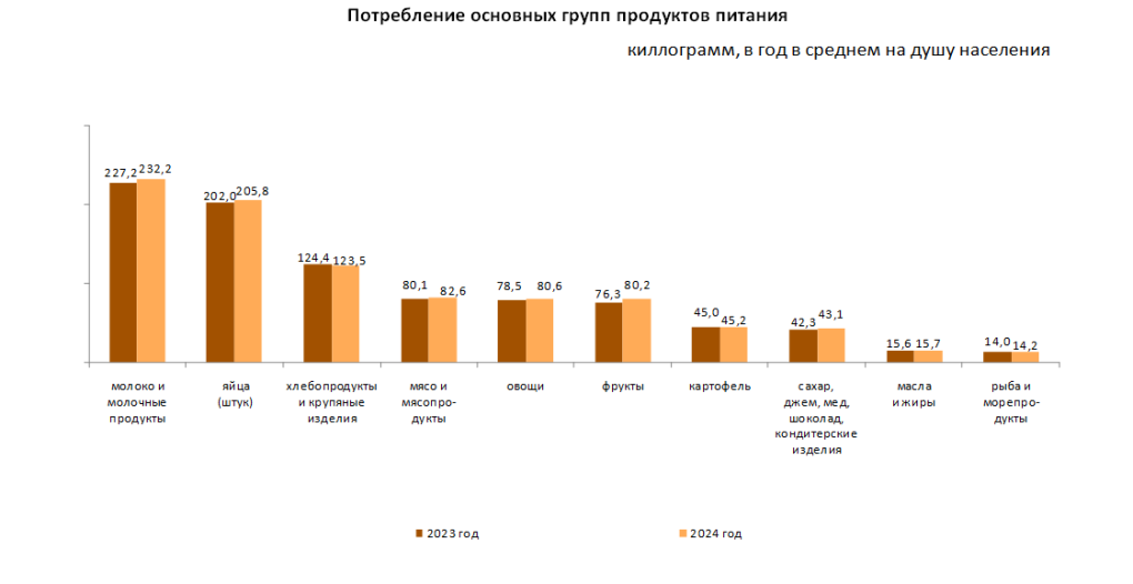 В 2024 году по сравнению с предыдущим годом наблюдался рост потребления по всем основным группам продуктов питания кроме группы хлебопродуктов и крупяных изделий.