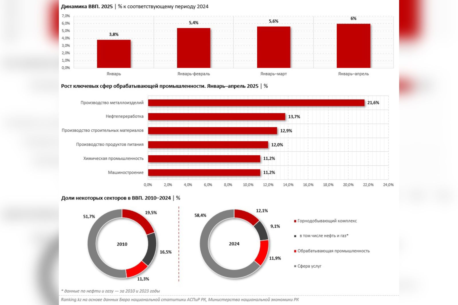 «Уверенный прирост экономики на 6% — позитивная новость, но особенно важно, что обрабатывающая промышленность растёт опережающими темпами. Пока рано говорить о полноценном структурном сдвиге, но тренд очевиден: структура экономики улучшается. Главная задача — усложнение производства и экспорт продукции с высокой добавленной стоимостью. Только сложная промышленная продукция способна обеспечить устойчивый рост, менее зависимый от сырьевой волатильности, создать хорошо оплачиваемые рабочие места и запустить мультипликативный эффект по всей цепочке поставок. Сегодня опережающий рост демонстрируют металлоизделия, нефтепереработка, машиностроение, пищевая и химическая промышленность — именно на эти сектора Казахстану стоит делать ставку», — подчёркивает макроэкономист, партнёр Dasco Consulting Group Эльдар Бейсимбеков.