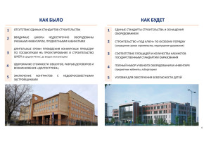 В ходе разработки Нацпроекта были учтены проблемы, ранее возникавшие при строительстве школ. Это недостаточность предметных кабинетов и учебно-лабораторного оборудования в построенных школах, длительность конкурсных процедур, длительные сроки строительства, отсутствие единых стандартов при строительстве школ и т.д.