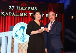 По сложившейся традиции прошла и церемония награждения. Нариман Турегалиев вручил нагрудный знак БҚО «Үздік мәдениет қызметкері» заведующей реквизитным цехом Жазире Тукжановой и Благодарственное письмо художнику по костюмам Елене Кузнецовой.