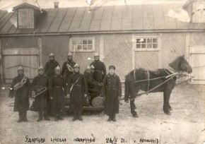 На старых снимках изображен конно-бочечный ход - повозка на конном ходу, на которой доставлялись к месту пожара огнеборцы, бочки с водой, пожарные насосы, оборудование и другие принадлежности.
