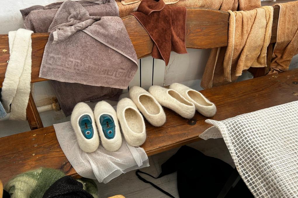 В маленькой и уютной мастерской нам довелось стать свидетелями процесса изготовления тапочек, а он весьма непростой и трудоемкий. На первом этапе овечью шерсть подготавливают: очищают от мусора, промывают, сушат и прочесывают, чтобы волокна стали ровными и мягкими. По словам работниц, стараются чаще всего использовать шерсть мериноса, так как она хорошо сваливается и приятна на ощупь. Затем формируется заготовка: шерсть раскладывают послойно в форме будущего тапочка. Но самое трудное в этом процессе – это мыльное валяние. Заготовку смачивают теплой мыльной водой и начинают тереть, скатывать и приминать ее, чтобы волокна сцепились. Когда шерсть начинает сваливаться, заготовку надевают на колодку и продолжают обрабатывать ее руками, придавая форму тапка. На этом этапе шерсть сжимается, изделие становится плотнее. Готовые тапочки ополаскивают от мыла, сушат, добавляют декоративные элементы – вышивку, узоры из шерсти. Для долговечности тапочкам пришивают подошву из экокожи.
