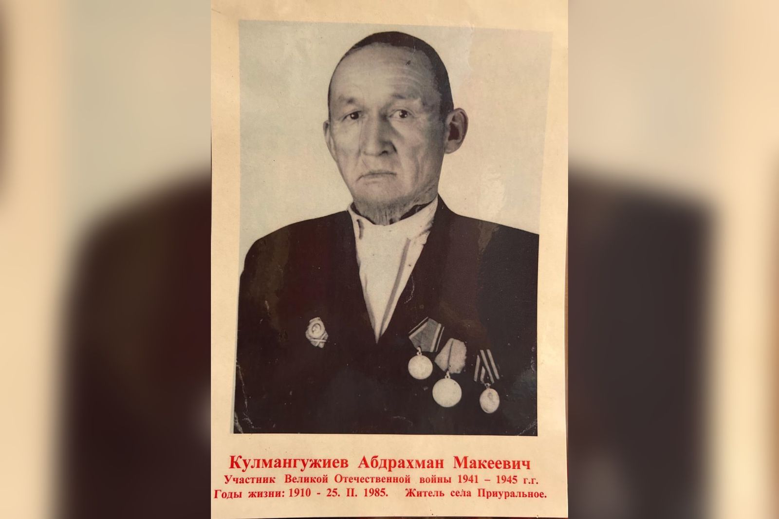 Мой отец Абдрахман Макеевич Кулмангужиев родился в 1910 году. Призван летом 1941 года с Илекского РВК Оренбургской области. Сразу направили на Ижевский оружейный завод. Их полк перекинули на оборону Москвы, т.к. враг рвался к сердцу Родины г.Москве.
